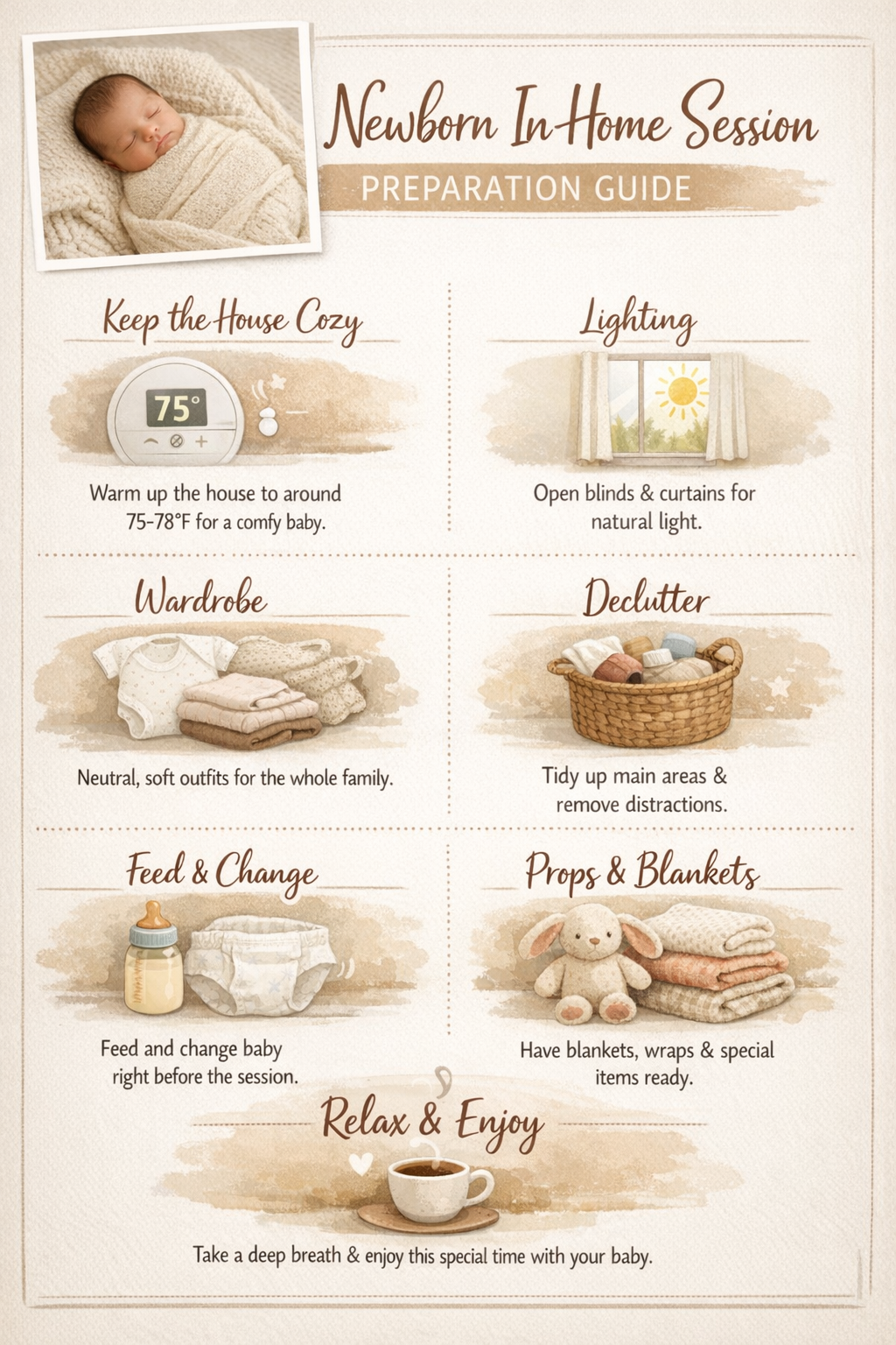 Please set your thermostat to 75–78°F about 30 minutes before I arrive. Even if it feels warm to you, this keeps baby sleepy and comfortable — especially during wrapped or diaper-only poses.
