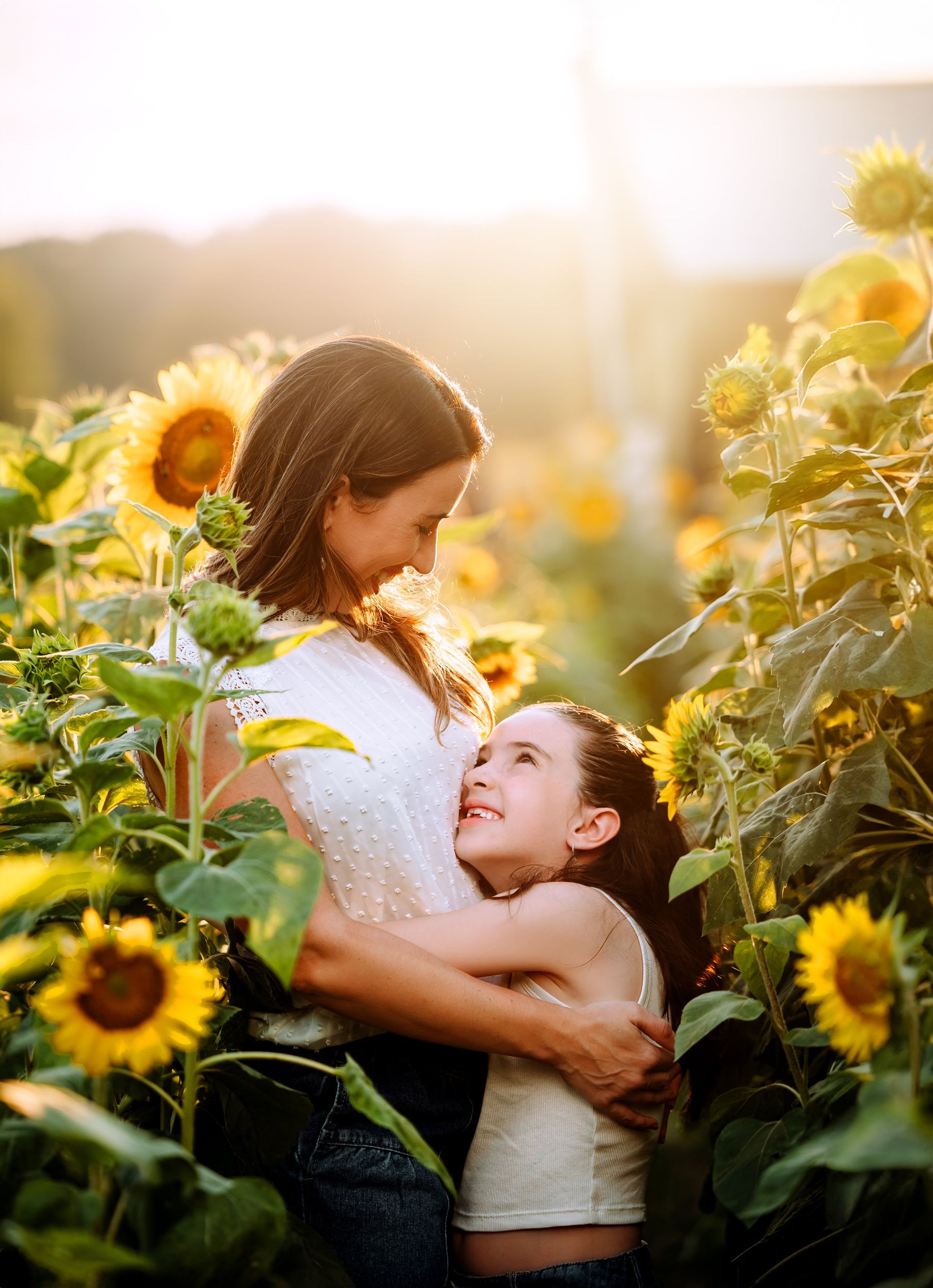 Sunflower Sessions take place in a beautiful sunflower field in the Raleigh, carefully scheduled during peak bloom and timed around golden hour for warm, flattering light. The open space allows for movement, laughter, and genuine connection—perfect for families, couples, and motherhood milestones.